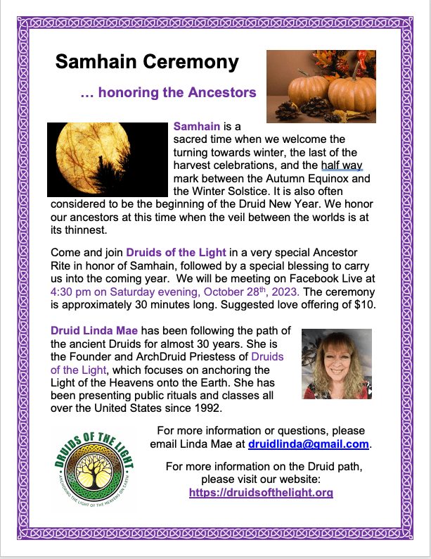 Also, as a reminder, our weekly Druid classes have resumed and we meet on Tuesday nights from 6:00-7:30 pm at Crystal Magic Psychic Center. These classes are also available online. If you are interested in attending, please leave a message here on the website, or a Facebook message for Druids of the Light.